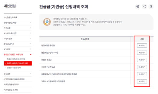 왼쪽 카테고리에서 환급금신청내역을 조회한다.