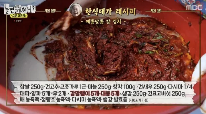어느 덧 김장 시즌이 다가왔습니다. 방송사에서도 앞다투어 김장에 대한 프로그램이 소개되고 있는데요, 오늘은 MBC 놀면 뭐하니?에서 소개된 박경례 대가의 감 김치 담그는 방법과 레시피에 대해 자세히 소개해 보겠습니다.