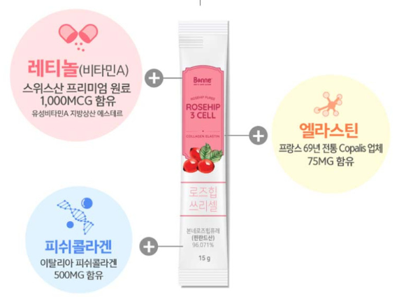 로즈힙과 엘라스틴은 한팩에 로즈힙 퓨레 99.625%와 프랑스산 엘라스틴 75mg을 함유하고 있다.