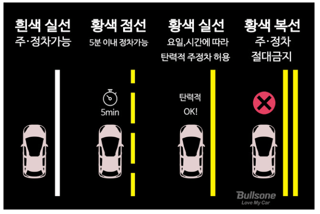- 황색 점선은 주차는 불가하지만, 5분 이내의 정차는 가능하다