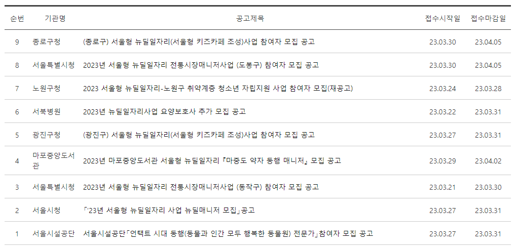 [서울 일자리포털 > 일자리 서비스 > 청년 일자리 > 뉴딜 일자리] 순으로 공고를 확인 할 수 있습니다.
