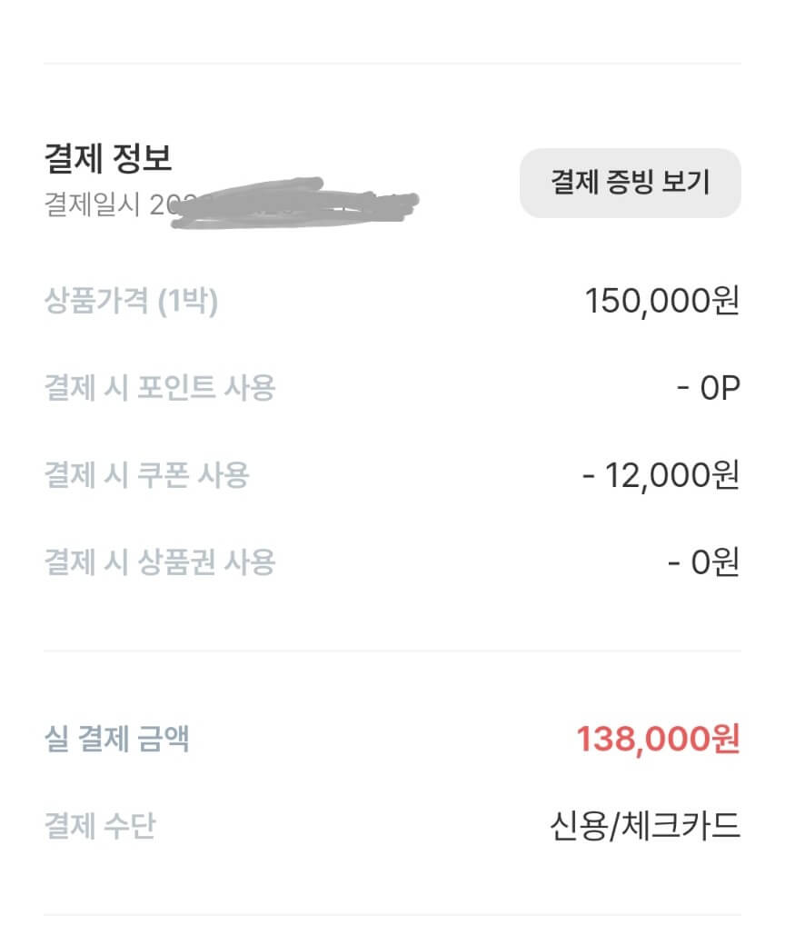 야놀자 어플에서 12,000원 쿠폰할인을 받아 138,000원 결제하였고 1인 추가해서 입실 시 1만 원 더 결제하였습니다.