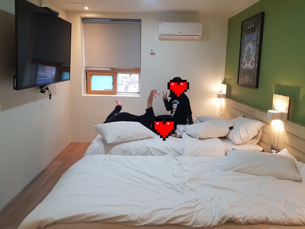 제가 예약한 디럭스트윈룸은 3인기준에 최대 4인까지 지낼 수 있는 곳이라 1명은 이불을 추가해서 바닥에서 잘 생각이었어요. 인원추가 시 유료라는 건 알고 있던 터라 입실 시 추가금 1만 원은 따로 결제했습니다.