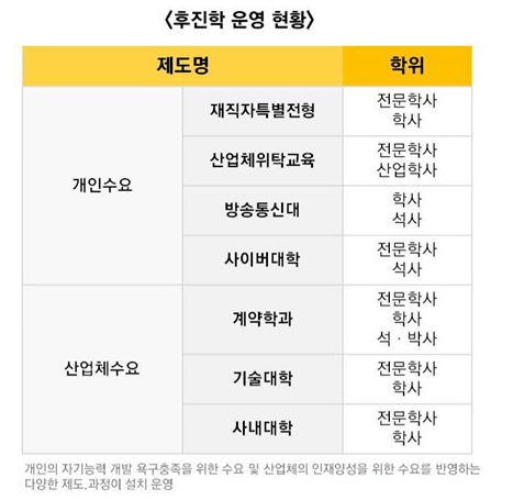 다시 말해, 후진학제도란 마이스터고, 특성화고 졸업 후 진학 대신 취업을 선택한 뒤 자기 분야의 전문가로 성장하기 위한 고등교육 제도입니다.