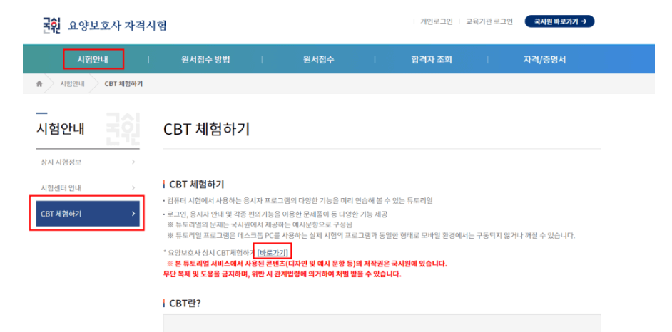 국시원 사이트에서 시험안내 - CBT 체험하기 를 통해 컴퓨터 시험 방법을 미리 확인해볼수도 있습니다.