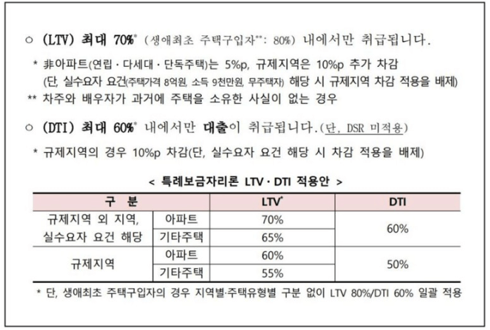 특례보금자리론 LTV, DTI 아파트 기준 최대 70% 기타 주택의 경우 65% 이내로 적용되며, 담보주택 소재지가 조정지역인 경우 및 CB점수 271~614점 또는 MSS점수가 운영기준에서 별도로 정하는 경우 또는 소득추정방법을 사용하는 경우 담보주택의 유형별로 10% 차감되어 LTV를 적용합니다.