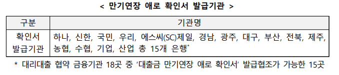 * 대환대출 취급은행: 국민, 신한, 우리, 하나, 농협, 기업, 대구, 부산, 경남, 광주, 전북, 제주 12곳 다만, 은행권의 만기연장이 어려운 대출을 대환 받고자 하는 경우 대환대출 취급은행 방문 전에 대환 대상이 되는 대출을 실행한 은행에서 ‘만기연장 애로 확인서’를 발급받아 대환대출 취급은행에 제출해야 한다.