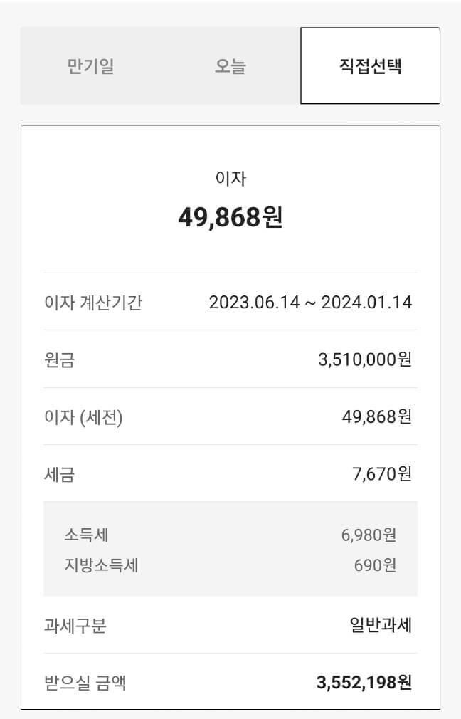 총이자는 44,652원, 세금 6,870원을 빼면 37,782원의 이제를 받게 될 예정이다.